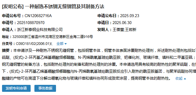 2025年9月23日,浙江新泰钢业科技有限公司成功申请一项名为“一种耐热不锈钢无缝钢管及其制备方法”专利,申请公布号为CN120682716A,申请日期为2025年6月30日。